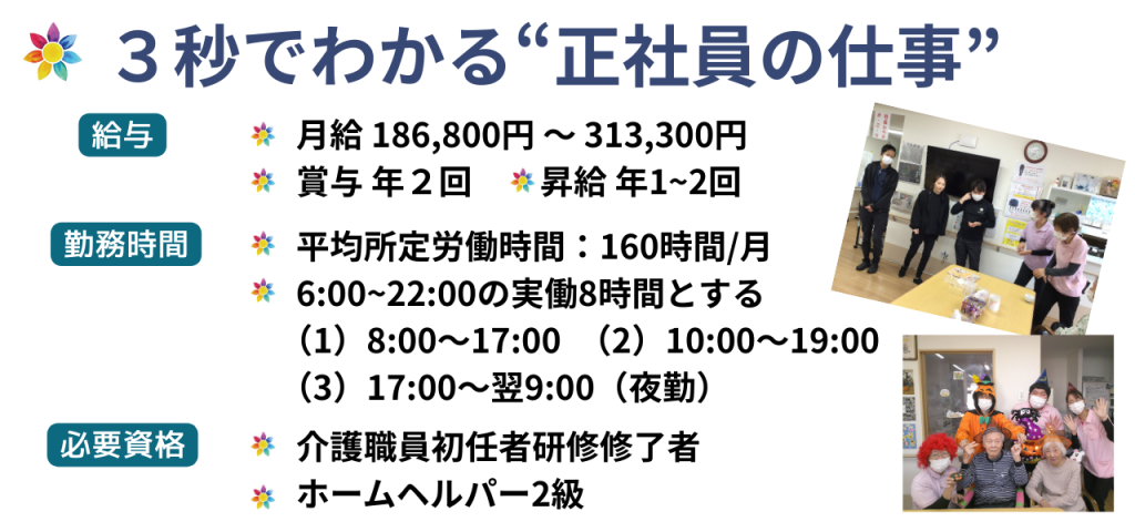 昇給あり(年1~2回)賞与あり(年2回) 有給休暇消化率 90%以上 スキルアップ制度あり(実務者研修受講支援・介護福祉士取得時休み優遇など) *各種社会保険完備 |